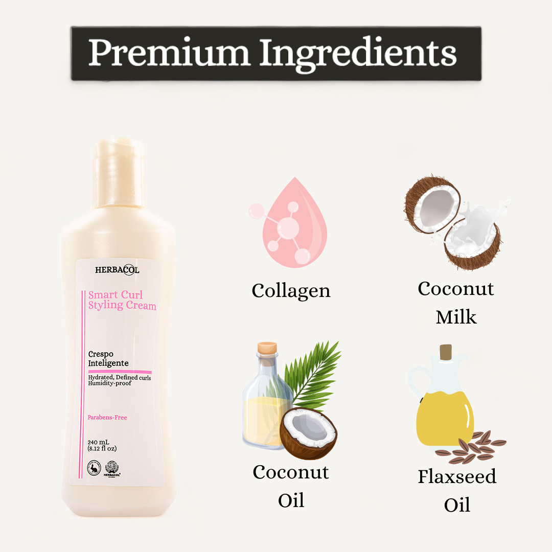 Our Smart Curl Styling Cream is enriched with a blend of coconut milk, flaxseed oil, and a variety of nourishing vegetal oils, our formula deeply nurtures and hydrates your curls, while defining them for a soft, radiant, and frizz-free look. Say goodbye to greasiness, and hello to natural, humidity-resistant movement, as our product imparts strength and elasticity to your hair strands. The infusion of coconut milk and oil ensures intense hydration, curl definition, making your hair more manageable and beautiful. Parabens and Formaldehyde free.